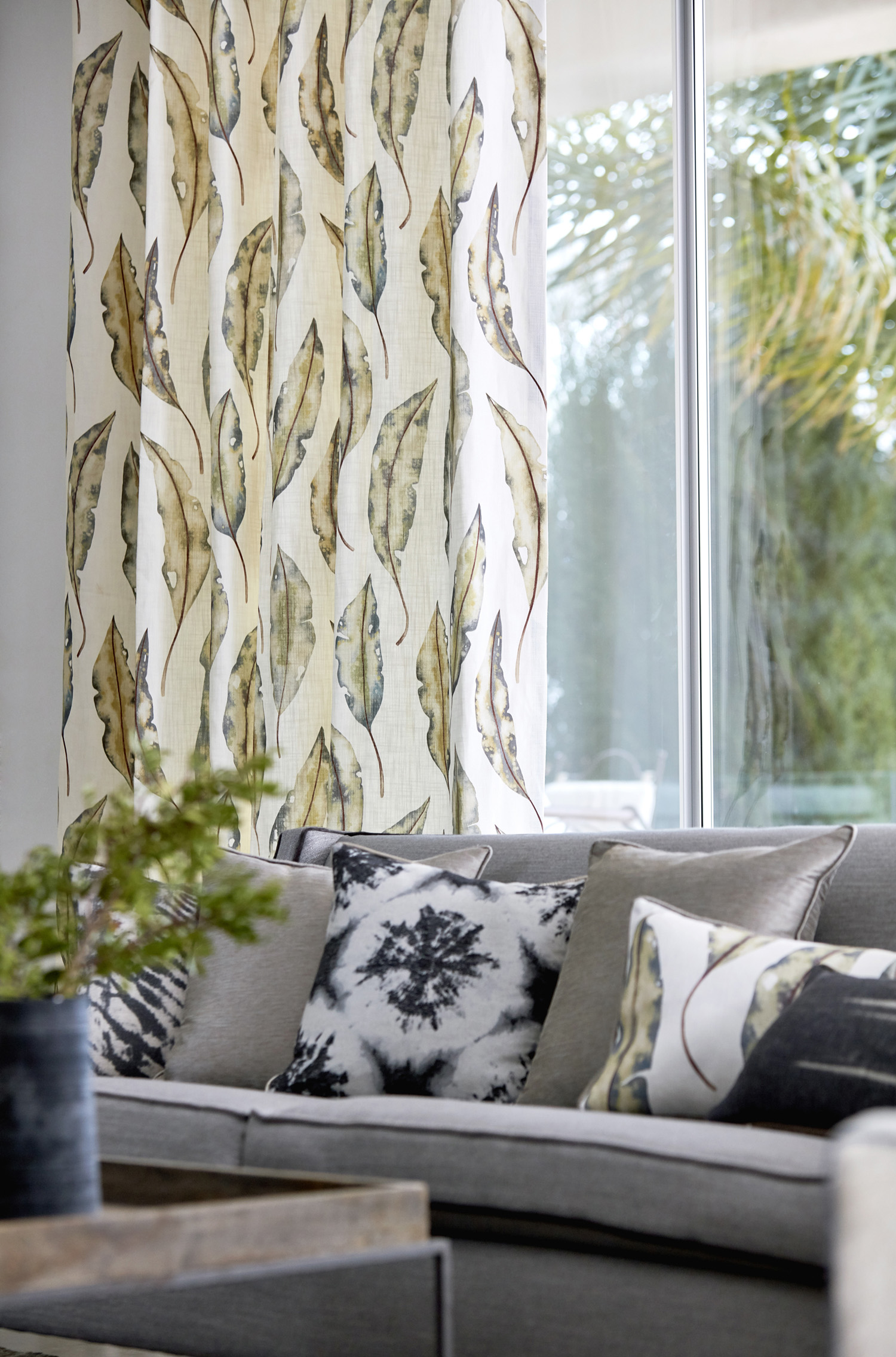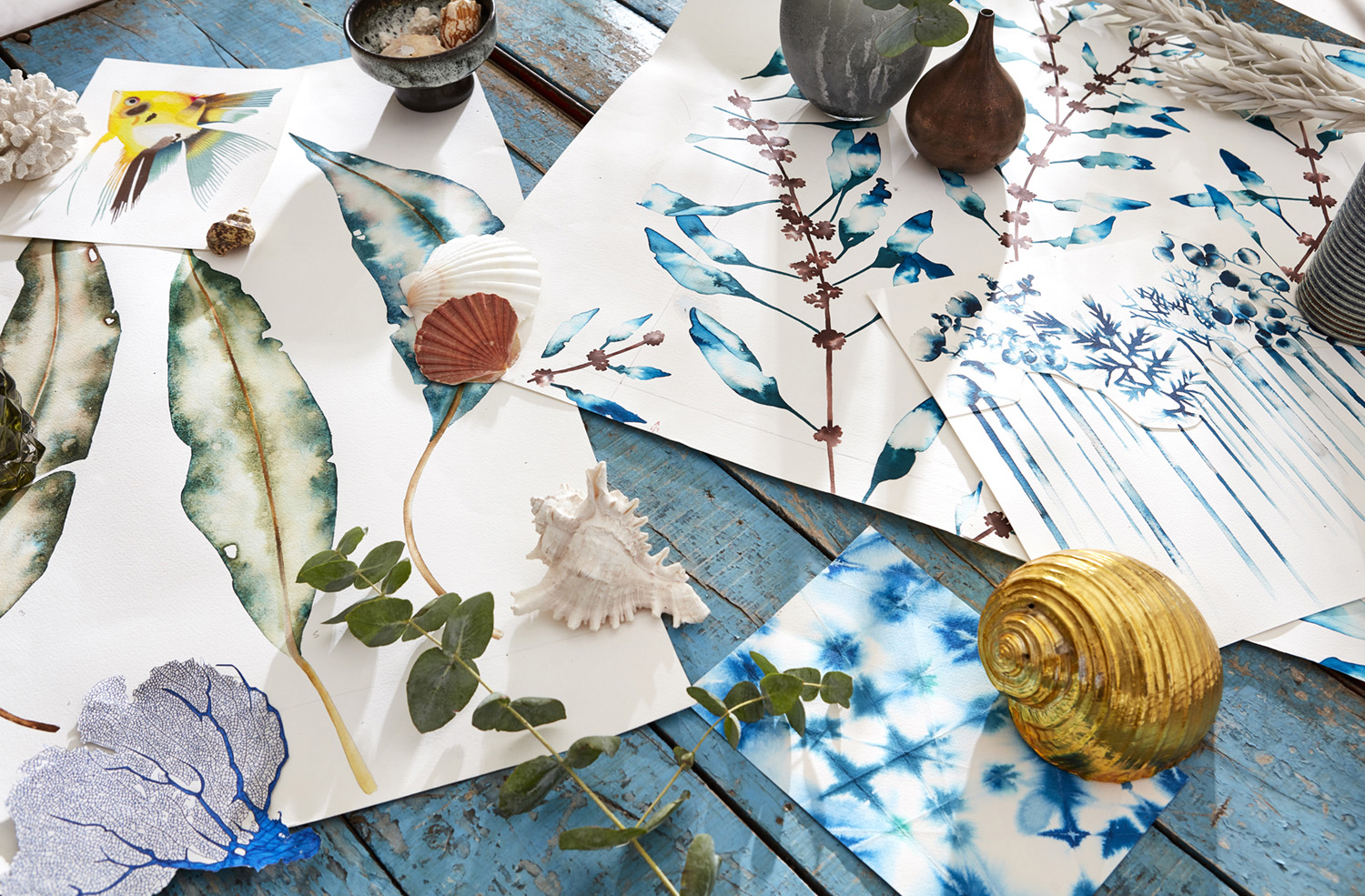 This design features as a printed fabric and a wallpaper for the harlequin brand. I painted this design using ink and salt. First using water to bleed the ink, then sprinkling salt onto areas to give a mottled effect. Just before the ink dried I then dabbed the leaves in areas to reveal white patches, adding to the leaf detail. Images Courtesy of ©Harlequin. All rights reserved.